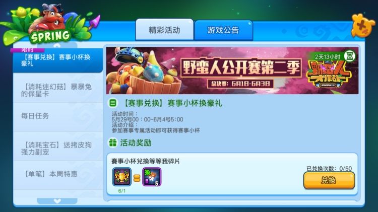 游戏内“赛事小杯换豪礼”现已开启限时兑换通道,宠物碎片、保星卡、迷幻菇、金币等你来兑换哟。