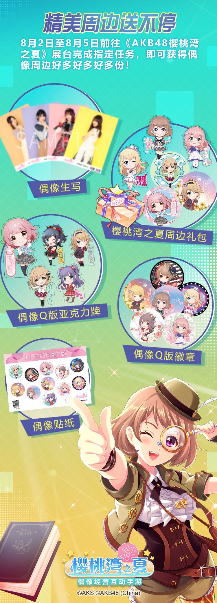 平时只有抽奖活动才能拿的偶像周边,这次免费送!8月2日~8月5日前往CHINAJOY《AKB48樱桃湾之夏》展台完成指定任务,全套周边轻松到手!