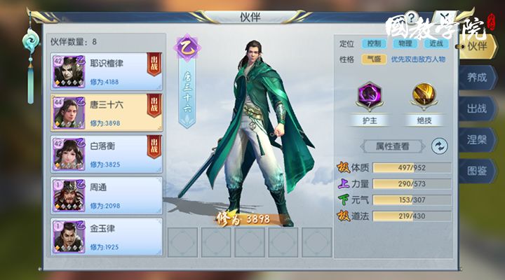 在选择伙伴时,最先要看的就是护主技能和绝技,看是否适合本门派特点。唐三十六的护主技能可以为提供体质和力量。体质和力量都是非常珍贵的一级属性,在属性面板中,每一点体质增加80生命,每一点力量增加2点物理攻击,这两个属性在一起可以说是攻守兼备,非常适合既需要嘲讽敌人承受伤害,又需要打出一定输出的槐院门派。