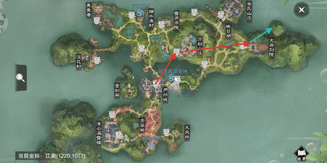 蓝色箭头为飞出地图自动返回帮派驻地附近