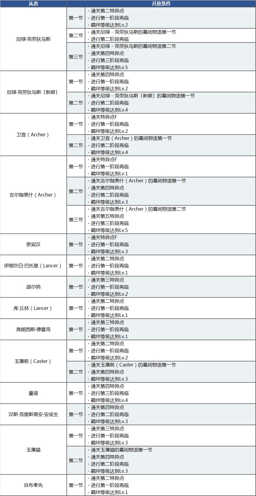 ◆对象从者以及关卡开放条件◆