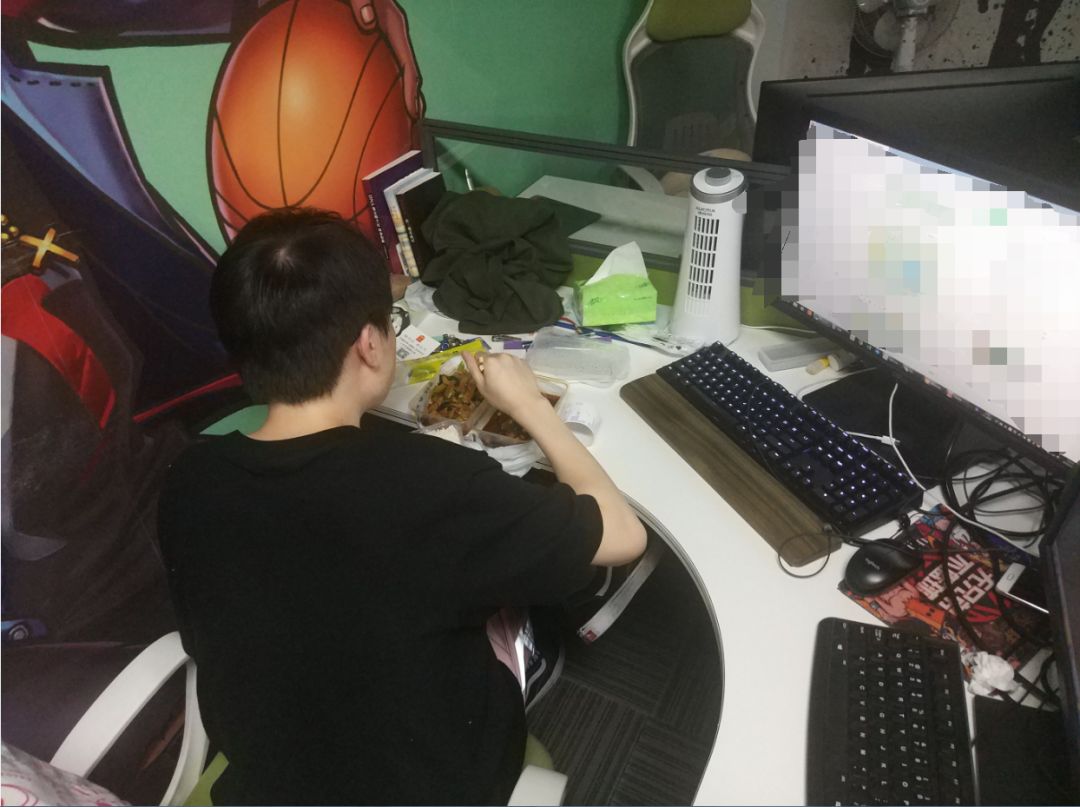 在拍摄的时候,小编还拍到了一张让人感动的照片。是其中以为研发小哥哥的,由于项目需求工期比较紧张,小哥哥忙到了忘记吃晚饭,正在边吃边工作,看着是那么的让人心疼。