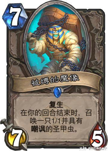 魔像属于赖场的一个随从,亡语召唤的甲虫会让快攻非常头疼。这张卡配合帝王裹布虽然在费用上有点不灵活,但打出效果对面基本是劝退的。