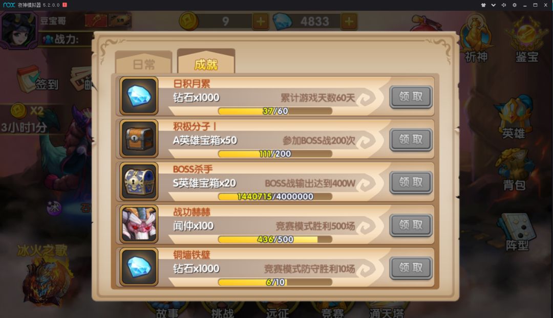 今天周五,明天后天拿下60分,顺利到巅峰,战力9400+6600,也还行了。