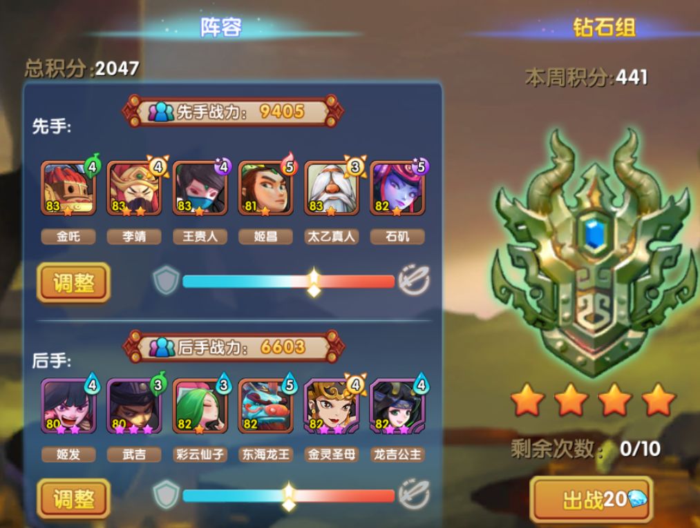 战力到了6500后,打到钻石后,会发现有很多电脑号,最后四星钻石,打的是70级紫2或紫3的,怎么打呢,看我开始的截图,基本攻防那里偏攻击多一点,我试过了,龙吉大概会放2-4个大,只要龙吉放了2次,就能赢,如果在放2个之前被秒了,就会输。