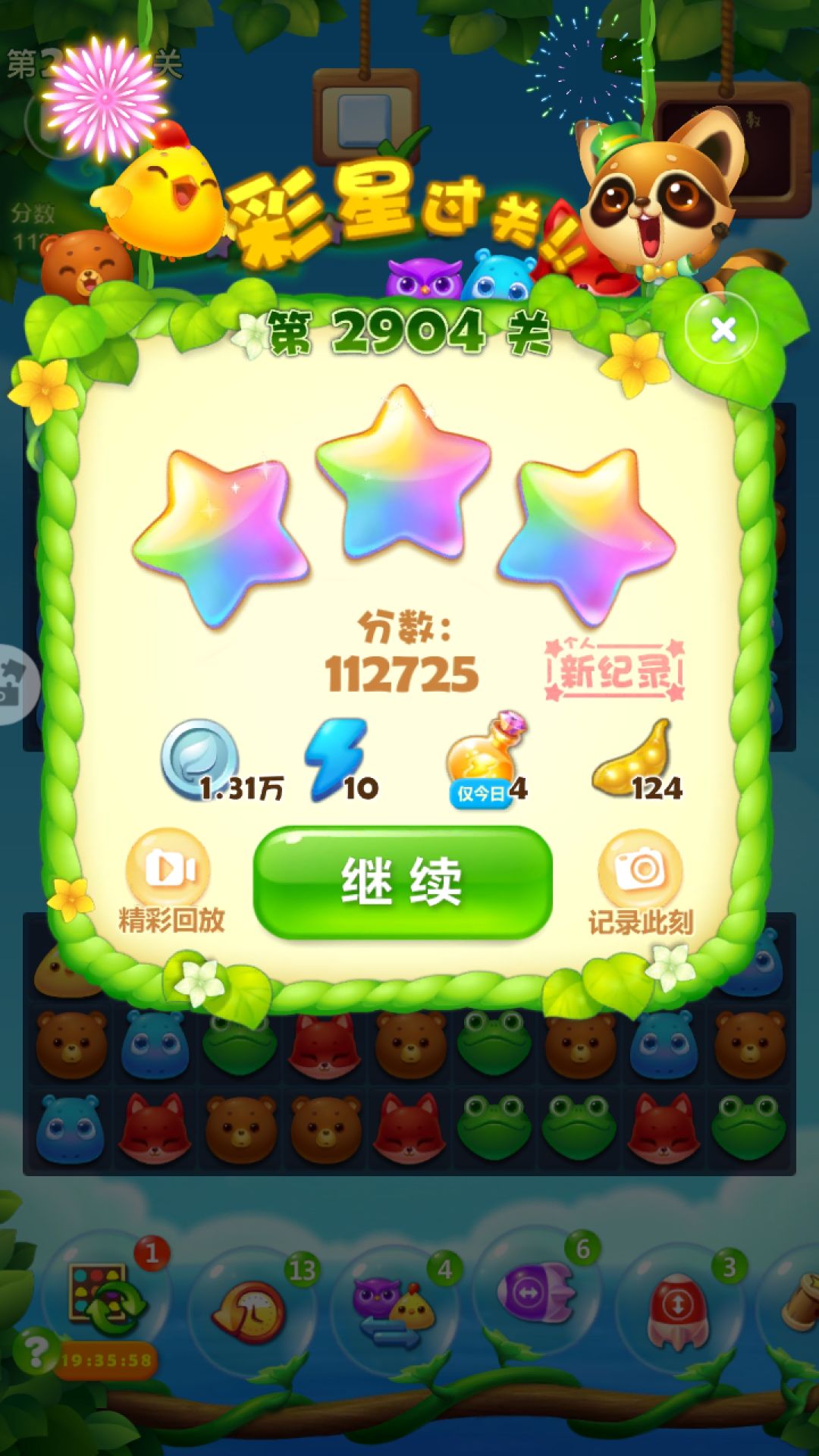 2904关,三星77000,请原谅我没有看到彩星分数,余六步过关,加三,特效开局