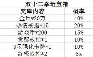 活动内容:活动期间登录游戏,即可领取双十二幸运宝箱。奖励将直接发送至游戏邮箱!