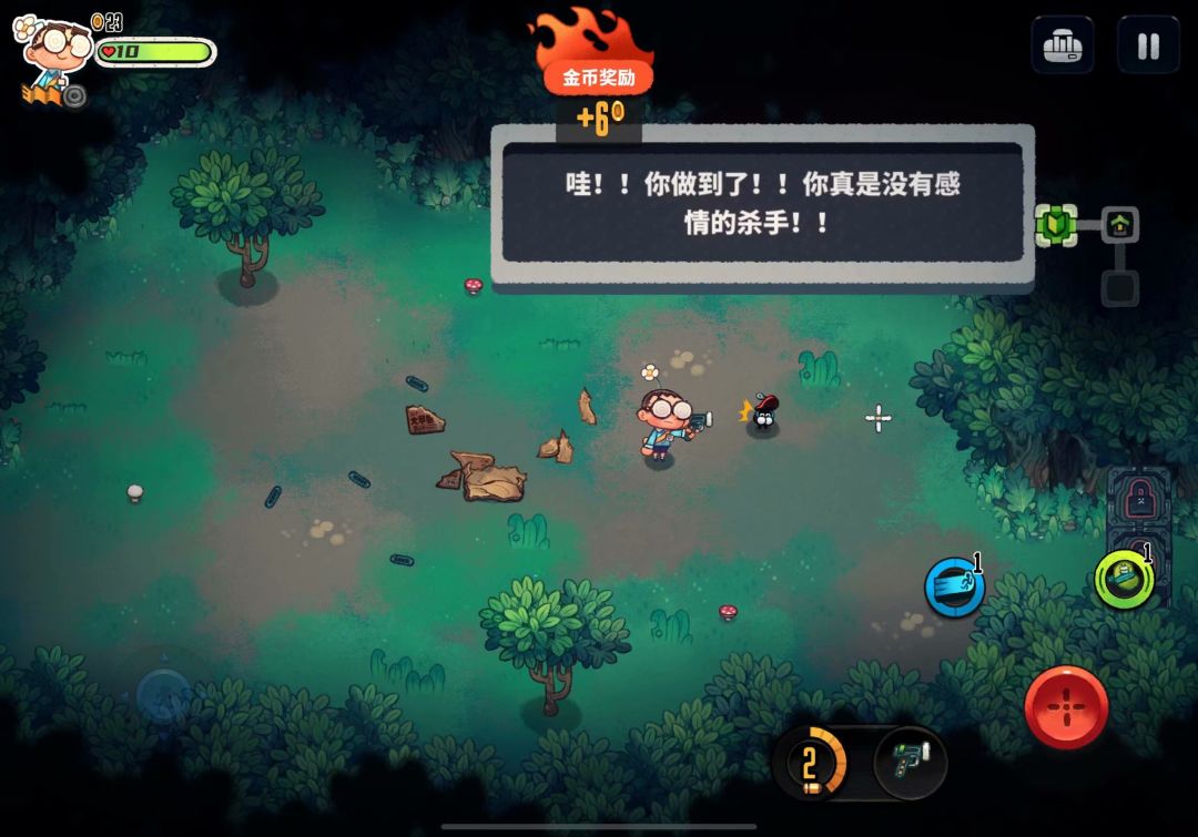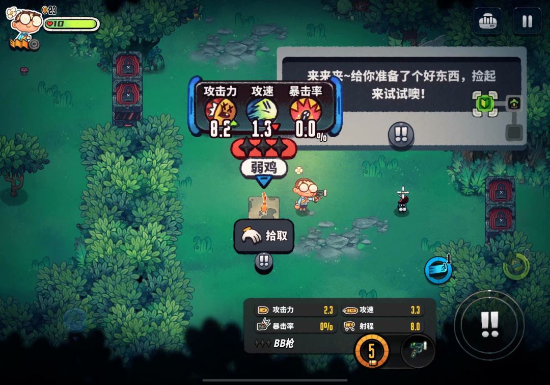 这次的新手教程做的是真的很可爱,还有个小人会给你鼓掌,并拿到一个武器:弱鸡(就是那个尖叫鸡)~这游戏的武器都很有创意,大家可以自己在游戏里摸索,这里就不剧透了~