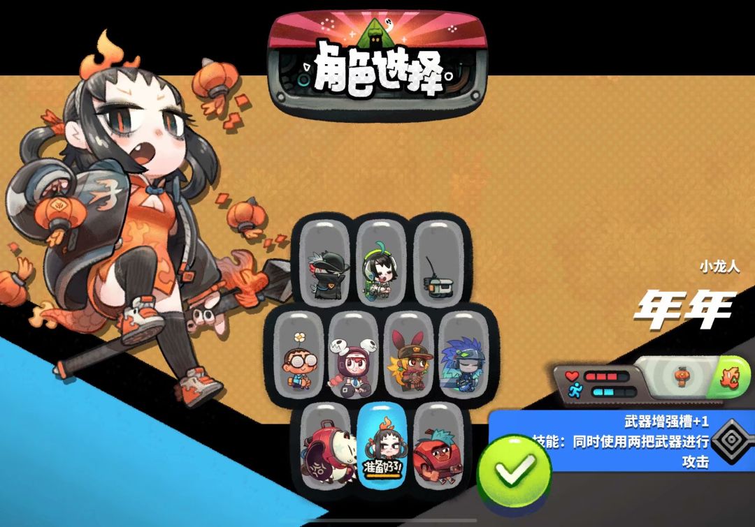初始角色4个,就是中间那一排的4个角色。然后最上面的那一排人物,前2个人物需要100果核解锁,最后一个机器人是3星难度通关后解锁。最下面的那一排人物,熊猫和苹果人都是100果核解锁,而中间的小龙人,年年,也是这次手机版的新人物,需要6星难度通关解锁~所以,小伙伴们努力通关吧~