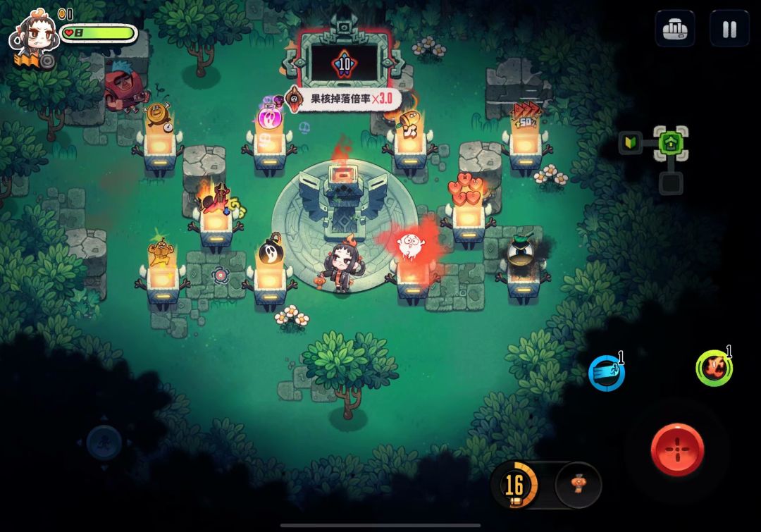 接着就是正式游戏了,刚开始是默认的普通难度,当然你也可以叫它简单难度,总之就是很简单,一路杀到头,就通关了。。。。然后会解锁困难模式。这个困难模式总共有10星难度,可以在出生地的右边通过点柱子来开启相应的星级难度。需要注意的是,一开始只有3根柱子,也就是3星难度,然后需要3星难度通关才能再解锁6星难度,而6星难度通关才能解锁10星难度,也就是最终的难度,就是这样。当然,这10根柱子你可以任意点火,点几根就是几星难度,不同星级难度下,果核的掉落倍率也不一样。