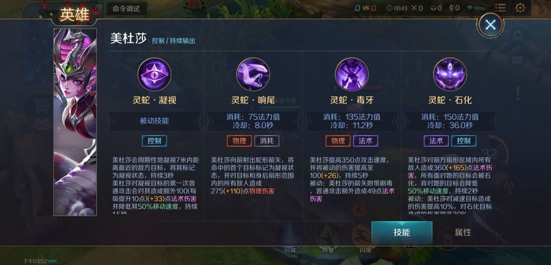 4.美杜莎极其害怕高机动性的敌方英雄,很容易被敌方位移或走位骗掉技能。此英雄对意识和手速都有较高要求,不是一个新手英雄。