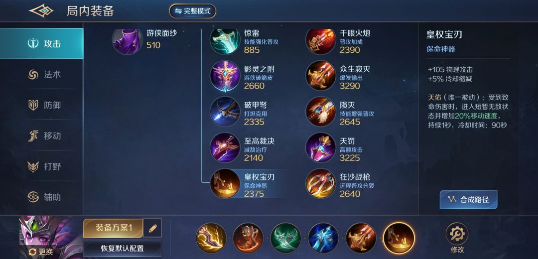 出装我建议出这套暴击移速装,前三件装备加强了暴击、攻速、移速,让美杜莎变得十分灵活。后三件装备提高了攻击力、吸血和保命能力。