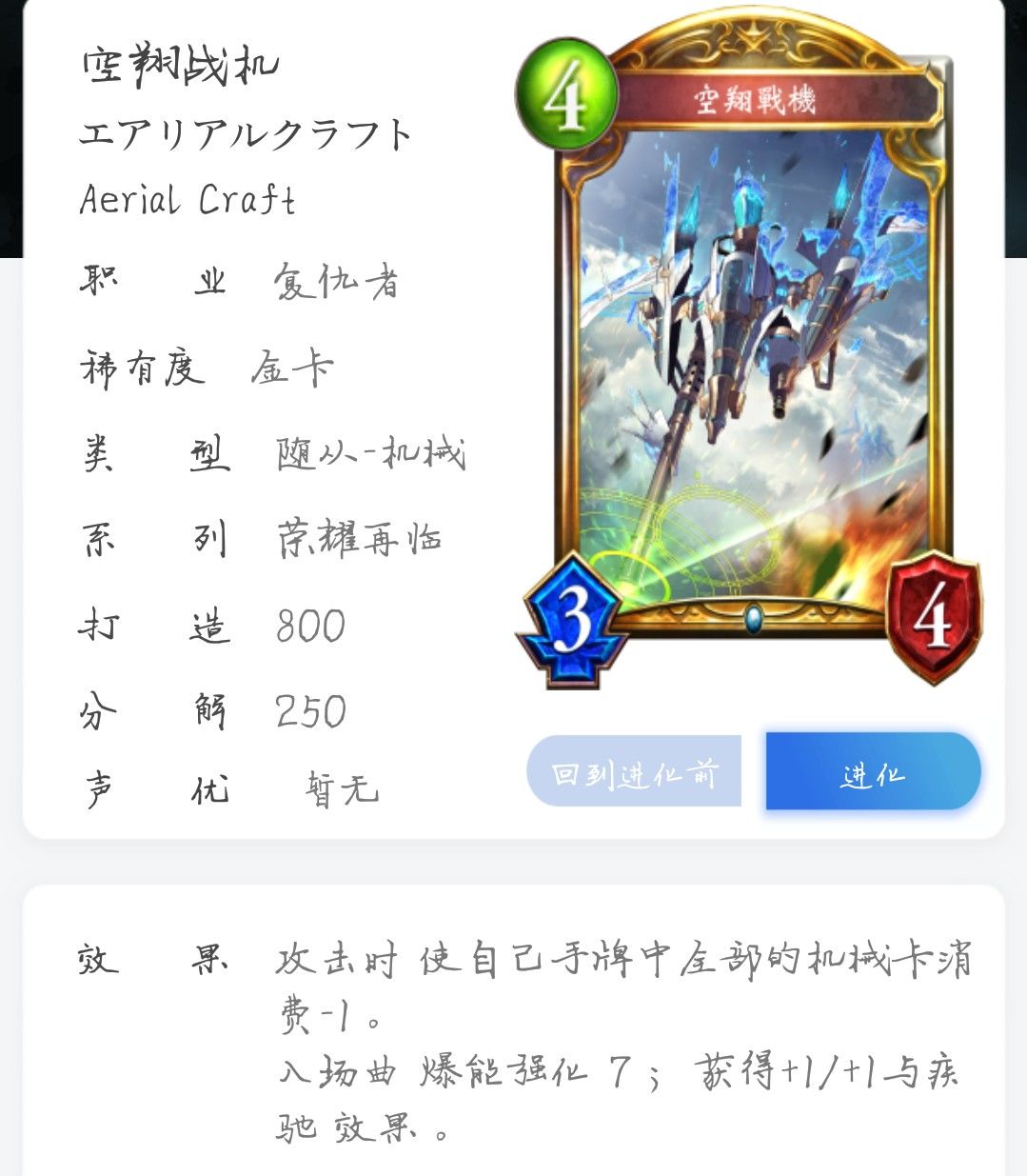 影之诗强者词条:疾驰,减费,赫克托。这张空翔战机占了两个,作为卡组的润滑剂,高文(因为作用和高文一样是4费攻击时减费,身材也一模一样所以被叫做高文。)可以说意义重大,它使那些价值极高的随从可以更早登场,进而奠定胜局,是一张非常强的后手卡。