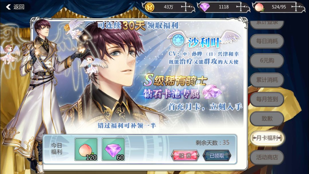 安逸过完新手教程之后可以去买一张月卡,可以获得大量钻石,最最最关键的是送三星骑士沙利叶!!!