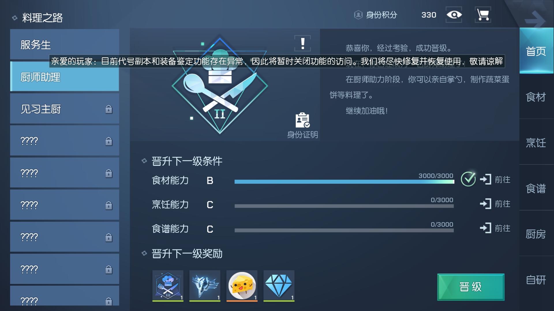 大概是官方在修改别的bug的时候搞出来的,我今天下午完成了厨师助理的两项菜谱学习,可晚上再登录的时候三项的数值全都清零了,见下图(食材那个是我晚上刷的)