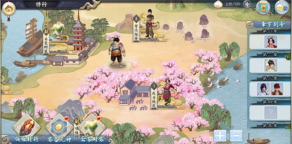 1、靠右边展示内容依次为:阶段小目标、修行(主要任务场景)、家园、帮派