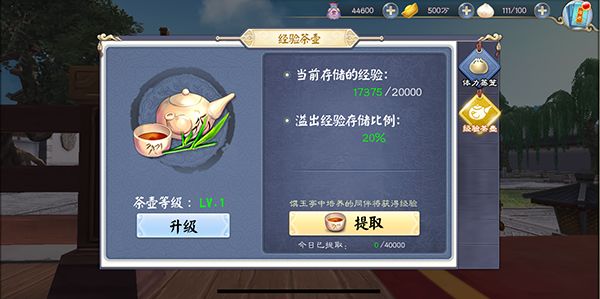 经验茶壶可以存储侠岚多余的经验,在提取的时候,会自动增加到馔玉亭上场的侠岚。