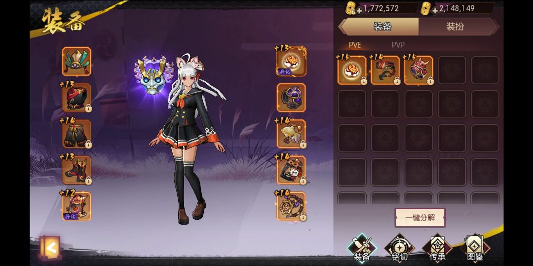 使用装备如下——因为要避免buff组件(天草悲鸣,毕舍遮)的随机影响,用别的散件破坏了一下套装效果,为了保证斩红郎不被打死,换了个13武器