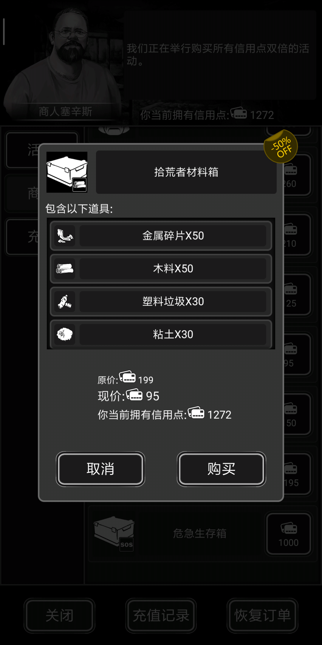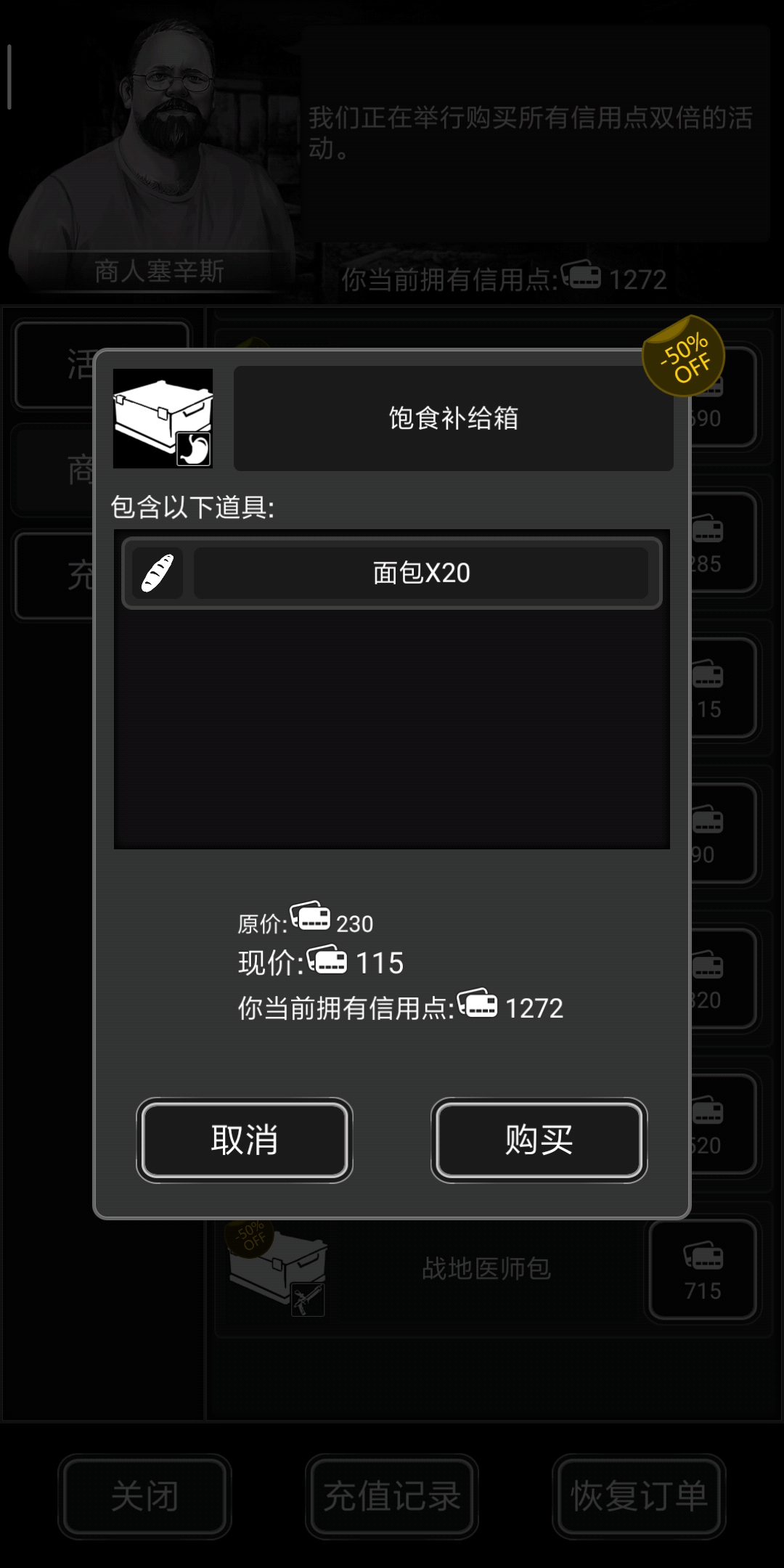 一开始先领信用点,然后买拾荒者买水,买面包,升家具做猎刀等10天,哦玩无尽一般的如下图