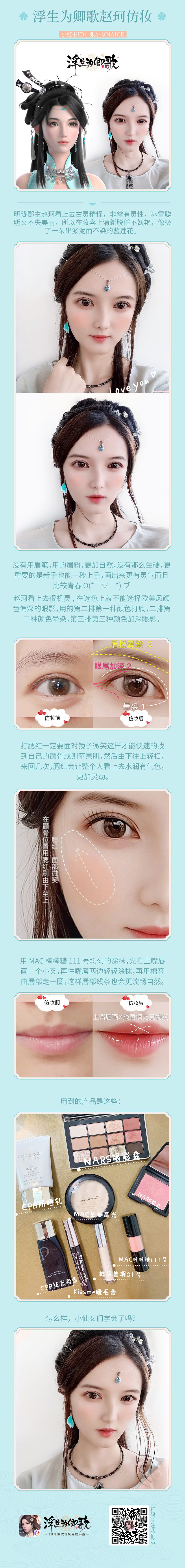除了甜美可人的苏媛以外,《浮生为卿歌》手游中还有一位重要角色,此人如淤泥而不染的蓝莲花,冰雪聪明又不失美丽,此人正是明珑郡主赵珂。小石光夕所仿妆的赵珂角色给人一种古灵精怪、天真无邪的感觉。值得一提的是此次的仿妆,为了使人物黛眉更加自然,小石光夕没有使用眉笔,而是用的眉粉,这样整体感觉更加自然,且不会显得生硬。加上精心处理的腮红、唇彩、眼影等等,使人充分感受“翩若惊鸿,婉若游龙”之感。