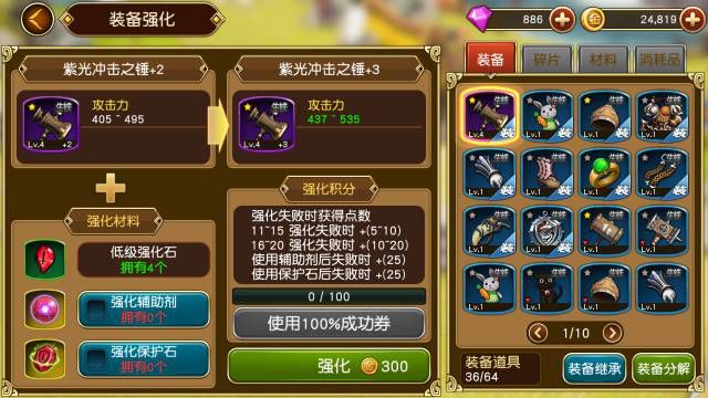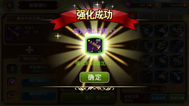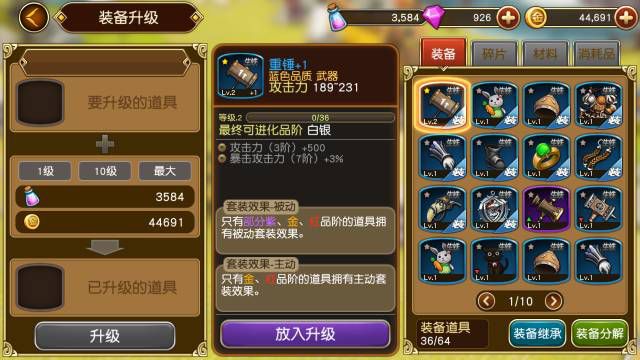 装备升级,这是一种比较基础的升级方法只需花费金币跟精灵粉末就可以,等级越高,提升的战力就越大,也就是说这种方法在前期比较适用。装备等级上限就是勇士的等级,升十级就能提升100多点战力!