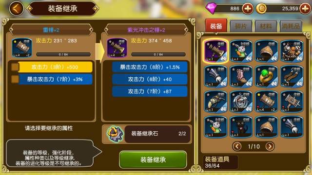 如果玩家获得一把紫色装备,蓝装不必要抛弃,只需装备继承石,就能将其他装备的能力通通继承过来,之前在其他装备身上的投入不会白白浪费了,也不需要在获得新武器的时候重新强化一遍。