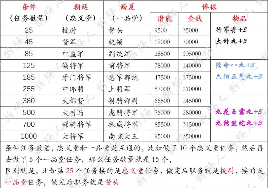 这里还有个官职系统,一品堂是西夏的官职,忠义堂是朝廷的官职,做哪方的官都行,随意,两方之间也可以来回切换。 做25次忠义堂或者一品堂的任务,就会给你一个官职,之后想要升官,就得刷到45次,下面是官职图。