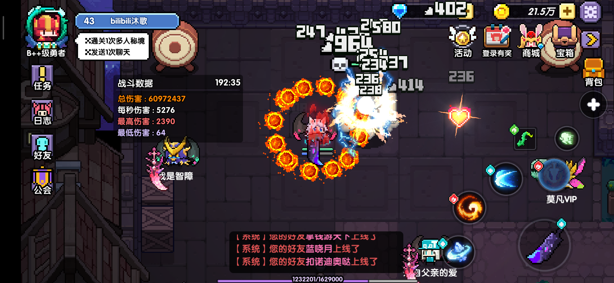 众所周知主城木桩是有血条的,然后我闲着没事干装个秘法鞋子挂机去睡觉,发现打到6000w血的时候木桩就剩40%的血,可得出木桩血量为1亿(滑稽),但是貌似血量过低就会回满(半恼)