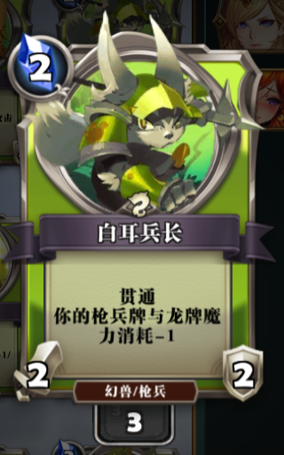 2攻2血的身材对于2费来说较为贫弱,2点生命值导致白耳兵长在登场的当回合,很容易被营地女法师或水箭术或智慧碾压击杀。但是枪兵部族的buff能力相对较好,所以如果能够实现对白耳兵长的快速buff,则可以保证减费效果的持续存在以及通过白耳兵长的贯通打出额外的伤害效果。