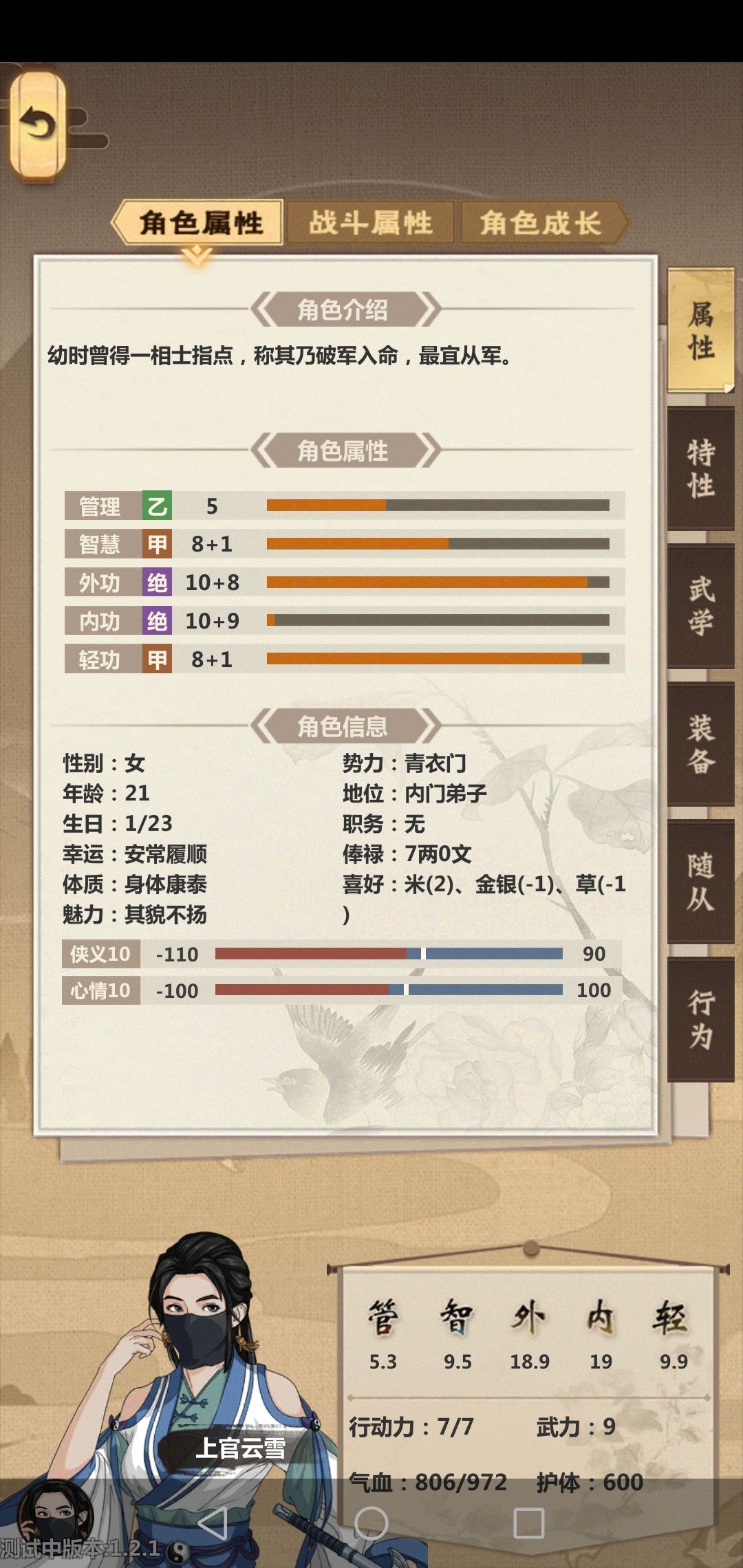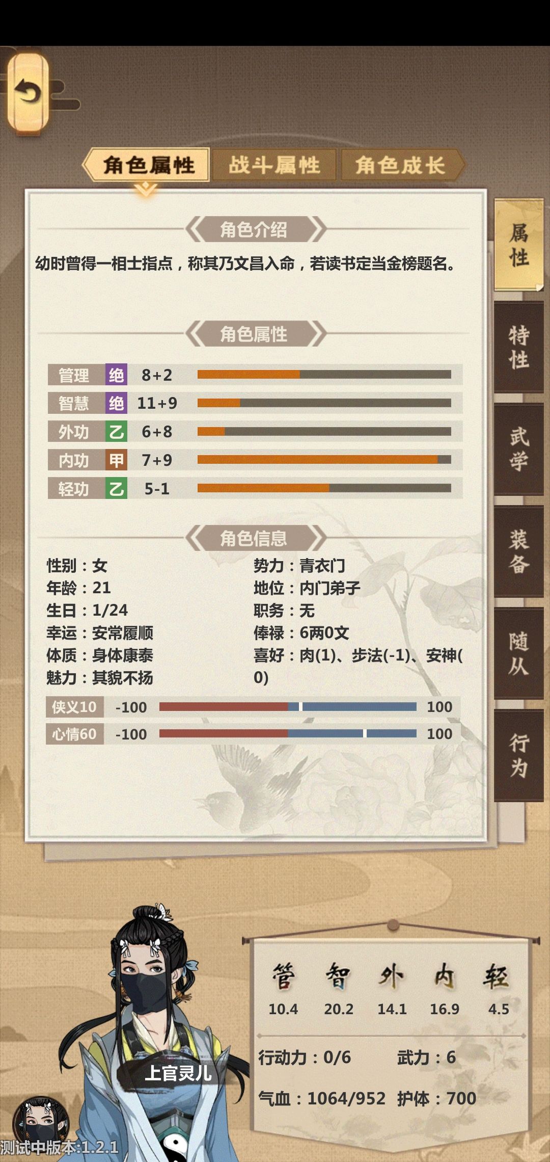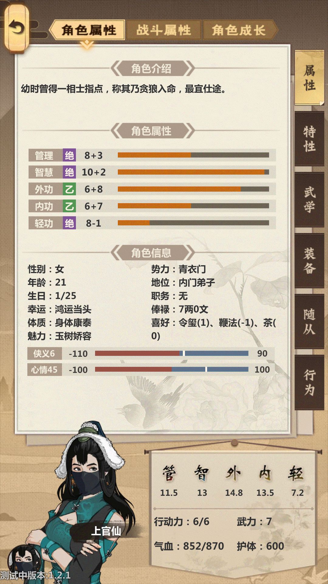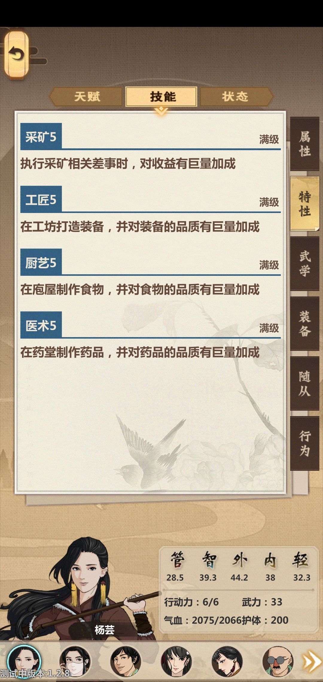 3.幕后运筹也就是偏管理向的主角,这个方向大体是给想要刷门派声望的小伙伴们,具体就是主角走全智慧路线,进门派之后直接挂门派大殿,每旬可以获得100+以上的门派声望,轻轻松松破6500(本人最高纪录7500),缺点显而易见,就是主角没有半点战斗力,所以需要一个强力弟子补完战斗任务,当前版本大师姐自然是不二选择。