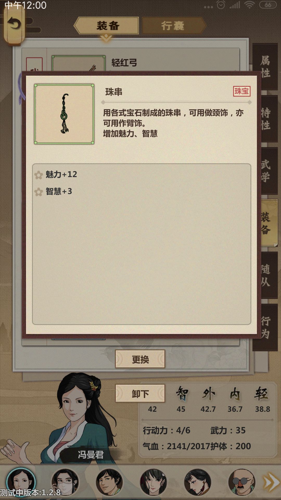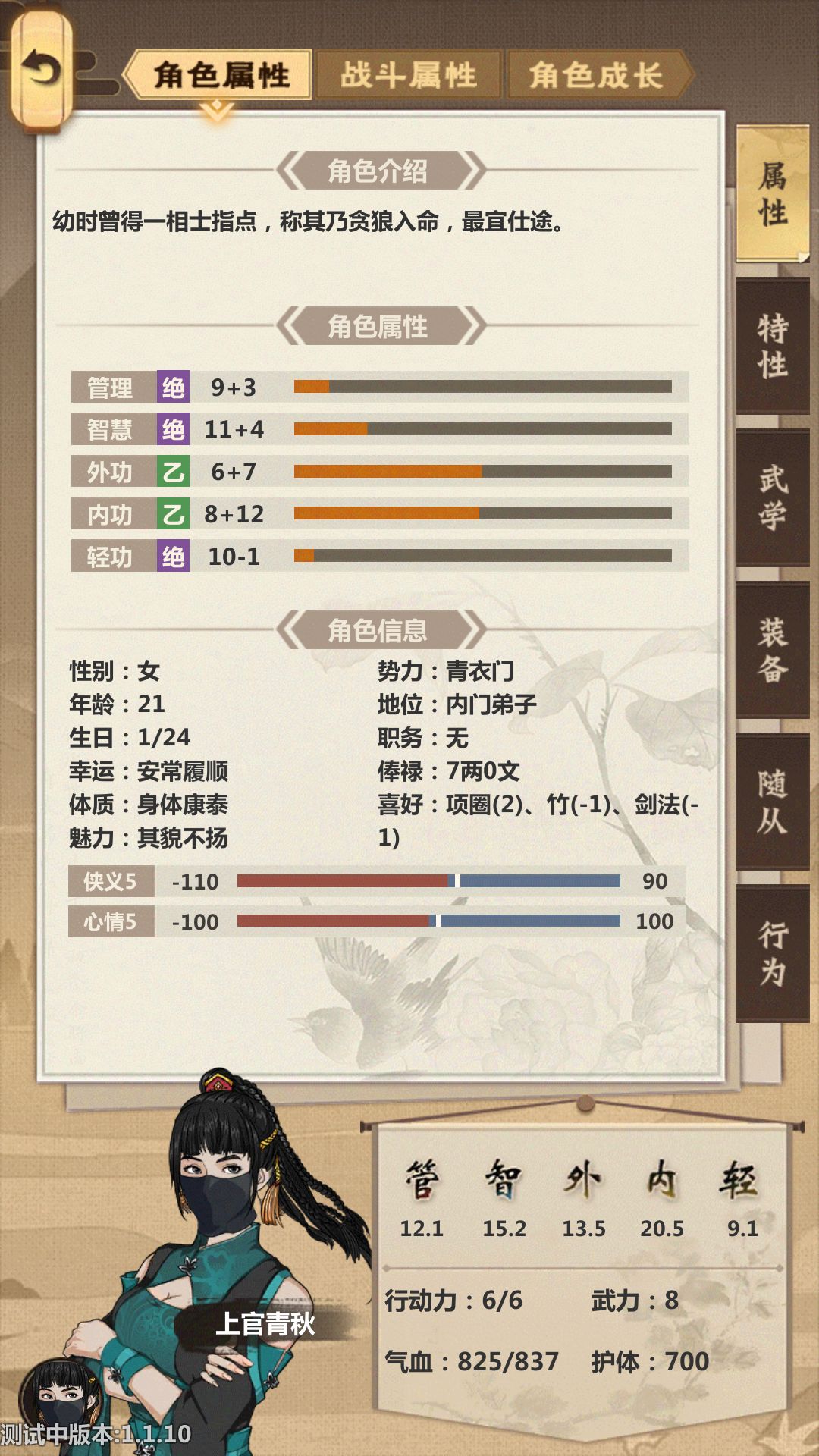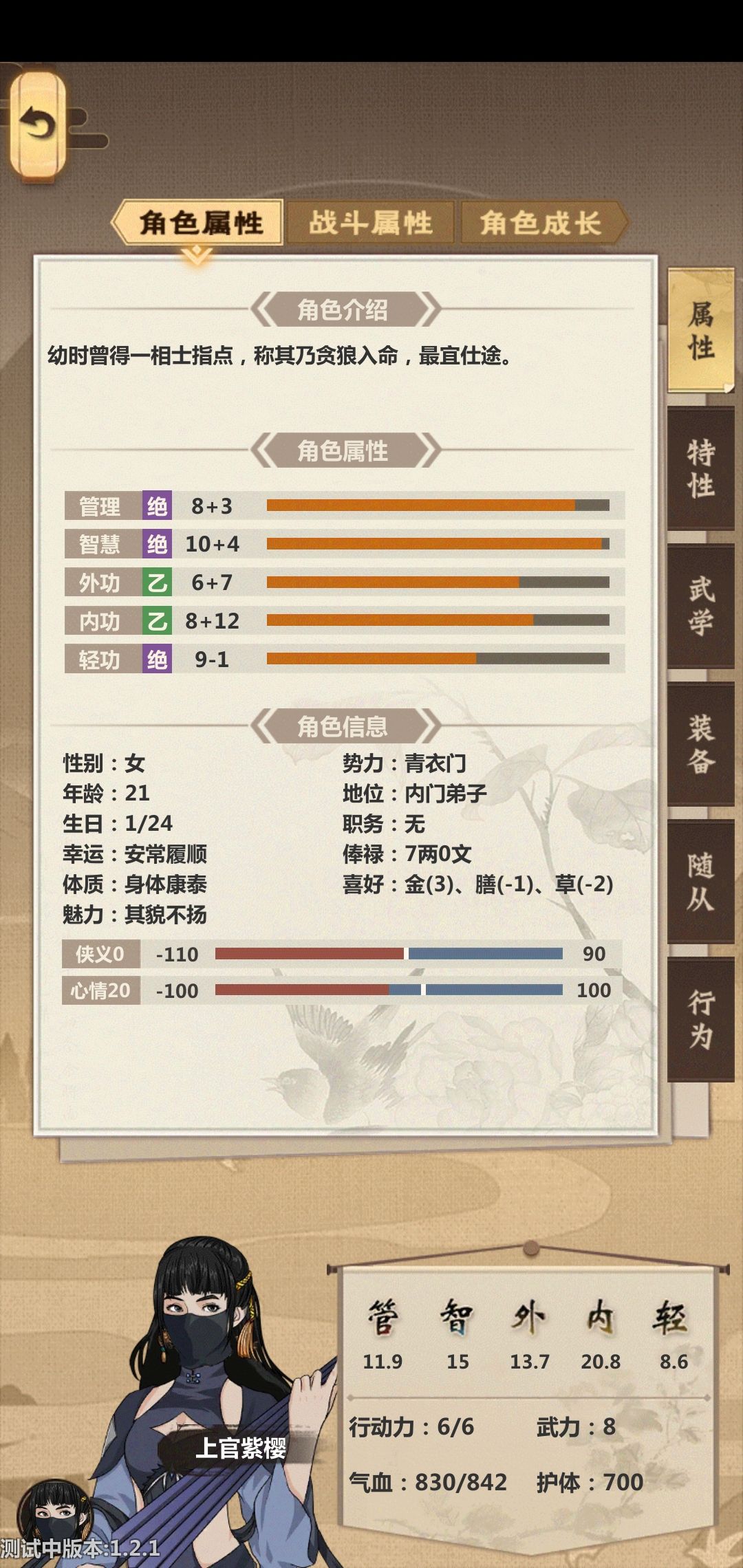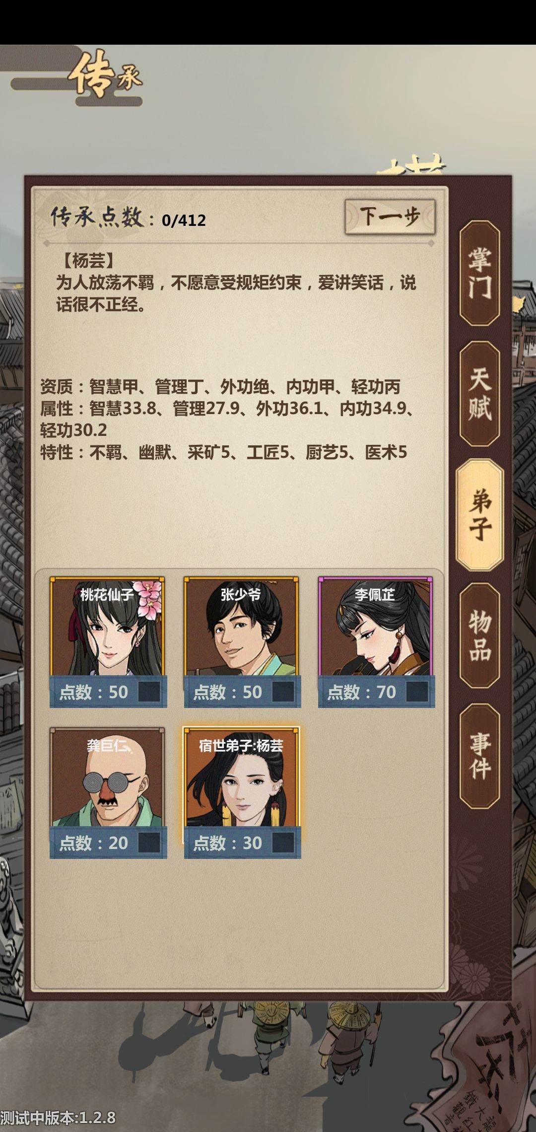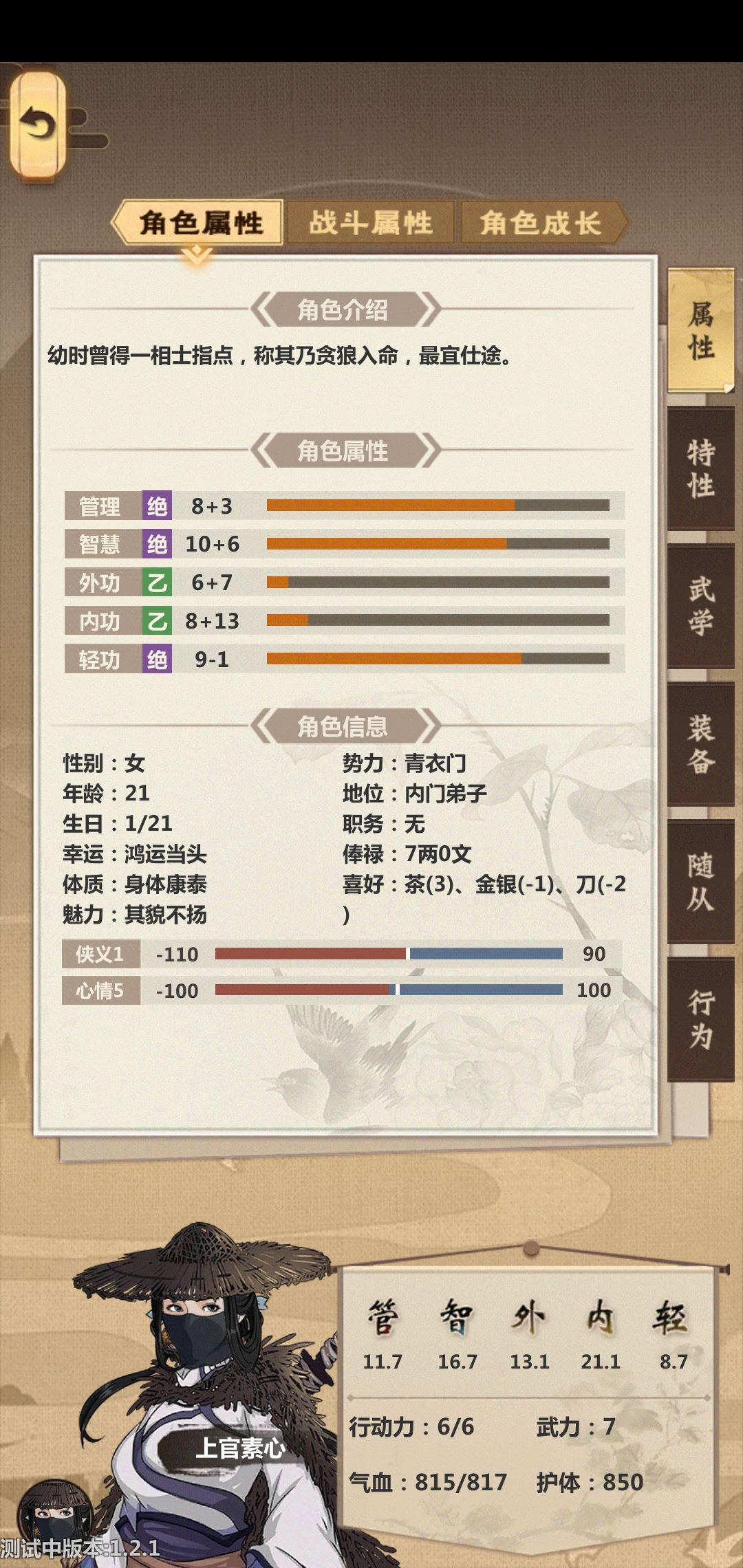 3.幕后运筹也就是偏管理向的主角,这个方向大体是给想要刷门派声望的小伙伴们,具体就是主角走全智慧路线,进门派之后直接挂门派大殿,每旬可以获得100+以上的门派声望,轻轻松松破6500(本人最高纪录7500),缺点显而易见,就是主角没有半点战斗力,所以需要一个强力弟子补完战斗任务,当前版本大师姐自然是不二选择。