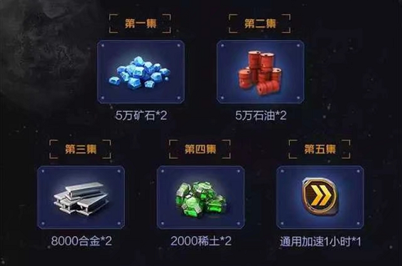 第一集:5万矿石*2 第二集:5万石油*2 第三集:8000合金*2