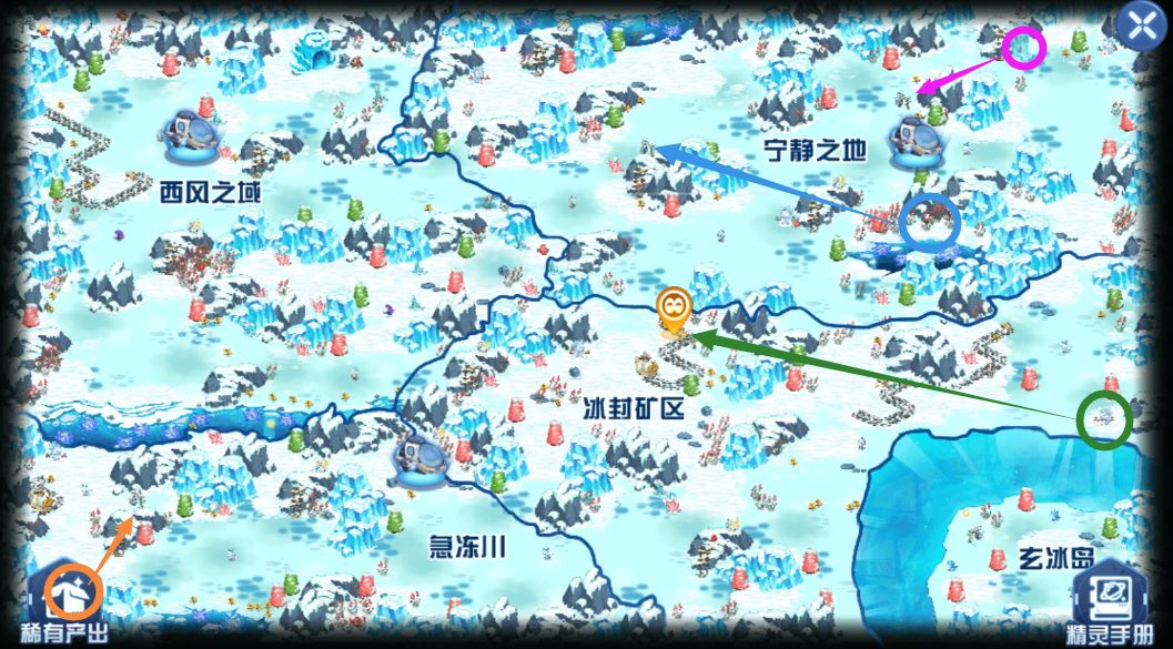 不需要雪橇、炸冰山所需要的四颜色石头:粉、绿、蓝、橙。石头与灯的位置如下图
