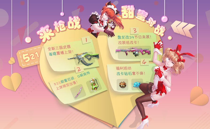 1、 限定甜蜜道具商城返场:爱心气球(521钻)、情人节花束(520钻)、丘比特爱弓(1314钻)、情人节QBZ95(490钻)、白色恋人M82(1790钻)、紫色魅惑沙鹰(500钻)、巧克力手雷(820钻)、蜜糖双持MP7A1(1314钻)、桃心手雷(820钻)。