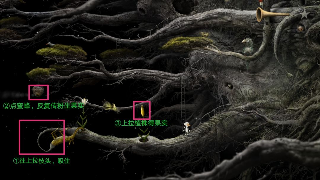 走近长鼻兽,向上拉它后面的树枝头,枝头就把它屁股给吸住了,生成一颗新植株。然后点最右边的蜂窝,让蜜蜂飞出来,去两株花反复多次采花蜜,蜜蜂传粉受精,得到的前两次果实会被上面的鸟吃掉,然后鸟就进入睡眠状态,获得成就。再次传粉受精,上拔植株得到种子。