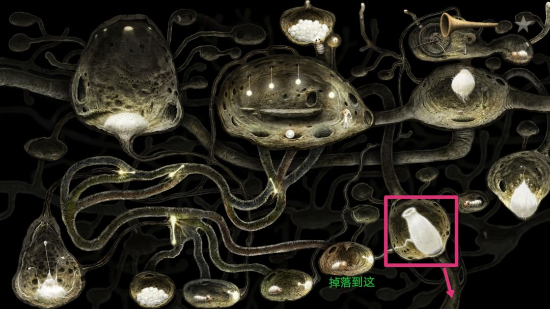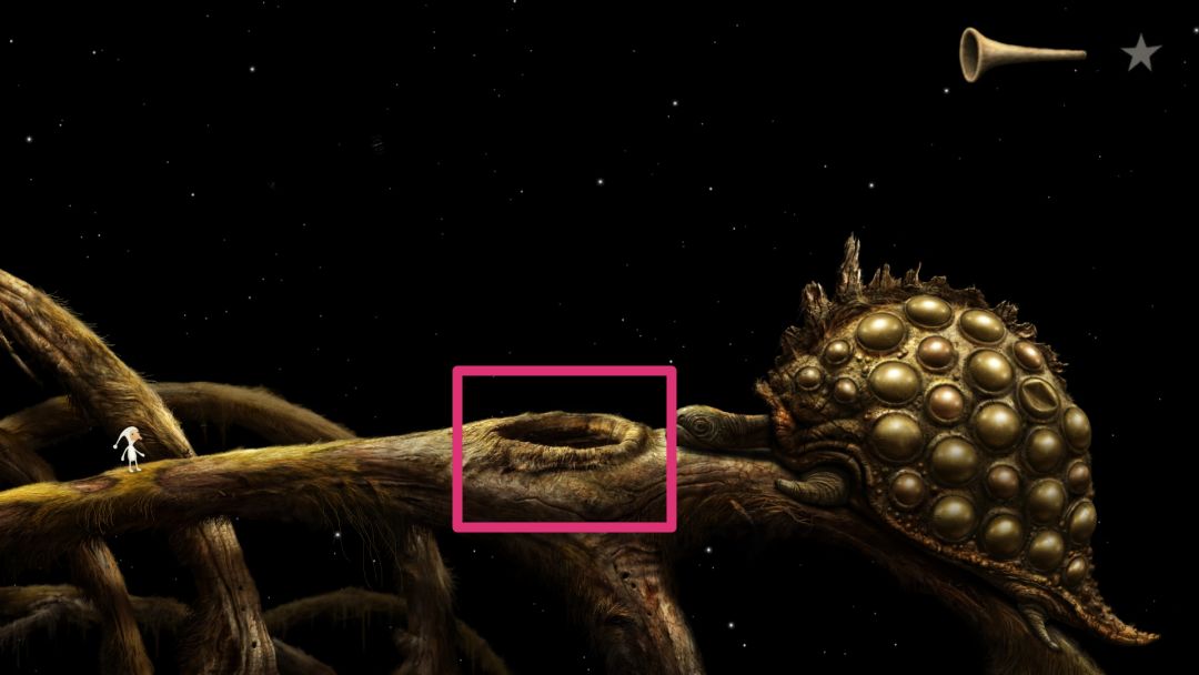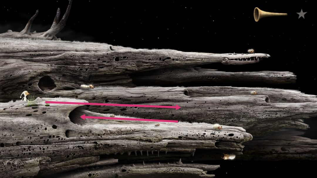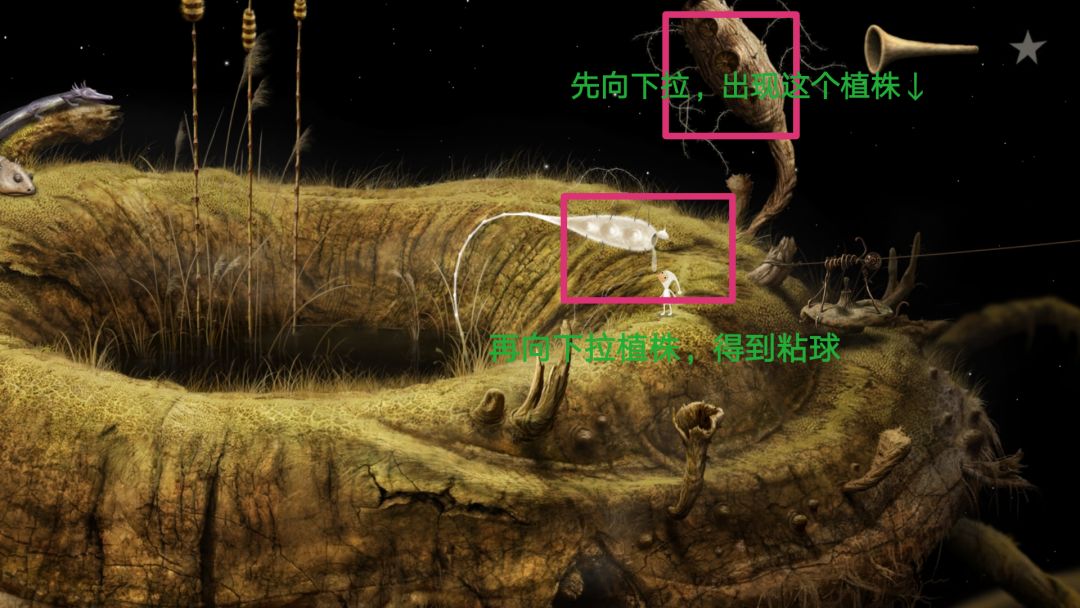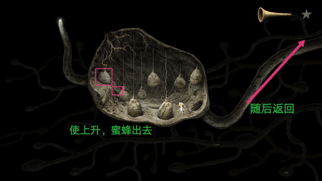 到这会看见许多往右爬行的蚂蚁,当蚂蚁爬行时起来就点一下,它会停下来唱歌,随后会飞来一只蜜蜂,获得成就。右边尽头有个类似于鳄鱼下颚的东西,向下拉然后下去去左边的洞口。
