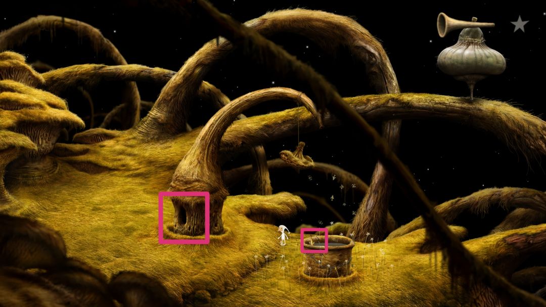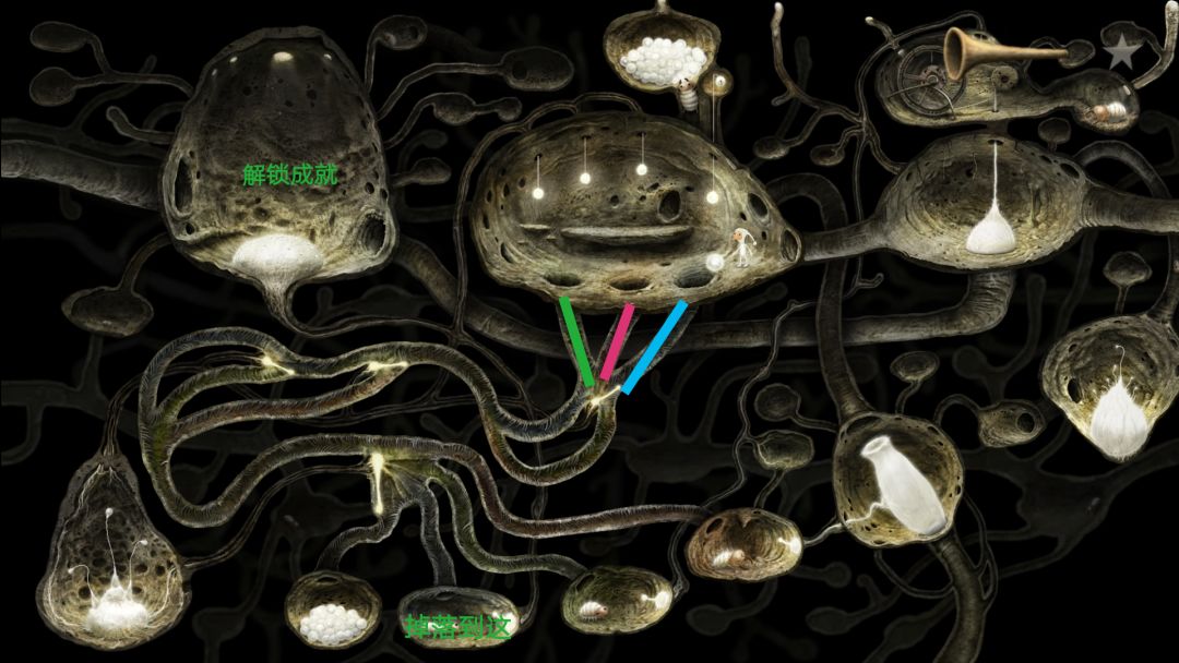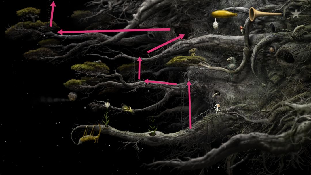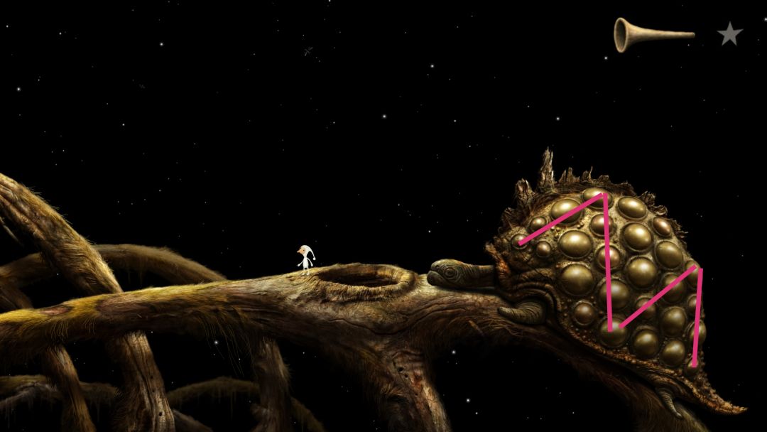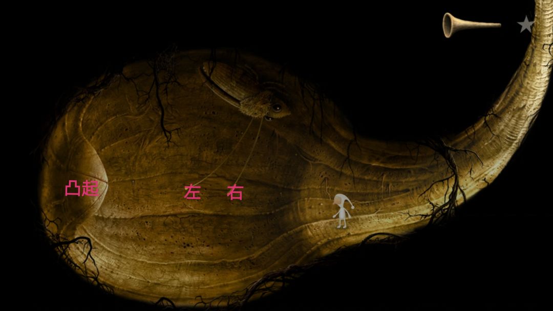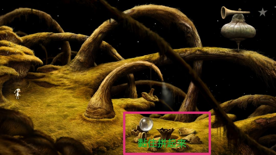 到这会看见许多往右爬行的蚂蚁,当蚂蚁爬行时起来就点一下,它会停下来唱歌,随后会飞来一只蜜蜂,获得成就。右边尽头有个类似于鳄鱼下颚的东西,向下拉然后下去去左边的洞口。