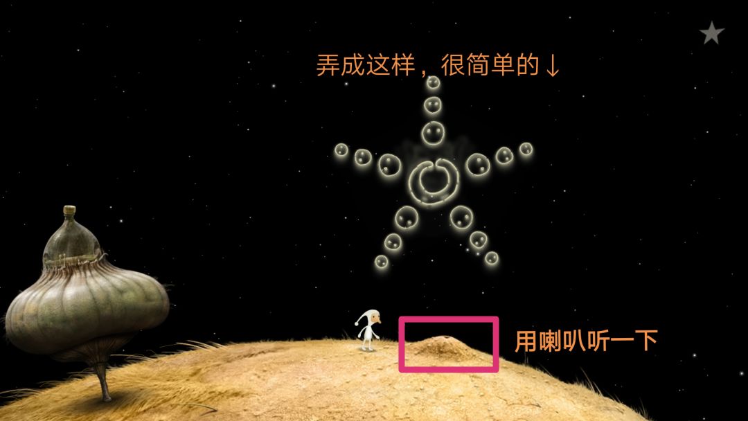 飞船飞出家乡星球,前往一个像被剥了皮的椰子的卫星。下了飞船,去右边那个凸起物用喇叭听一下,出现个五边形的东西。需要你调到五边各三个白色(如上图所示),拉住旋转换边,点击吃豆豆,再点击吐出豆豆,如果吞进的是红豆,吐出来的是白豆。成功后就进入凸起的小洞里。