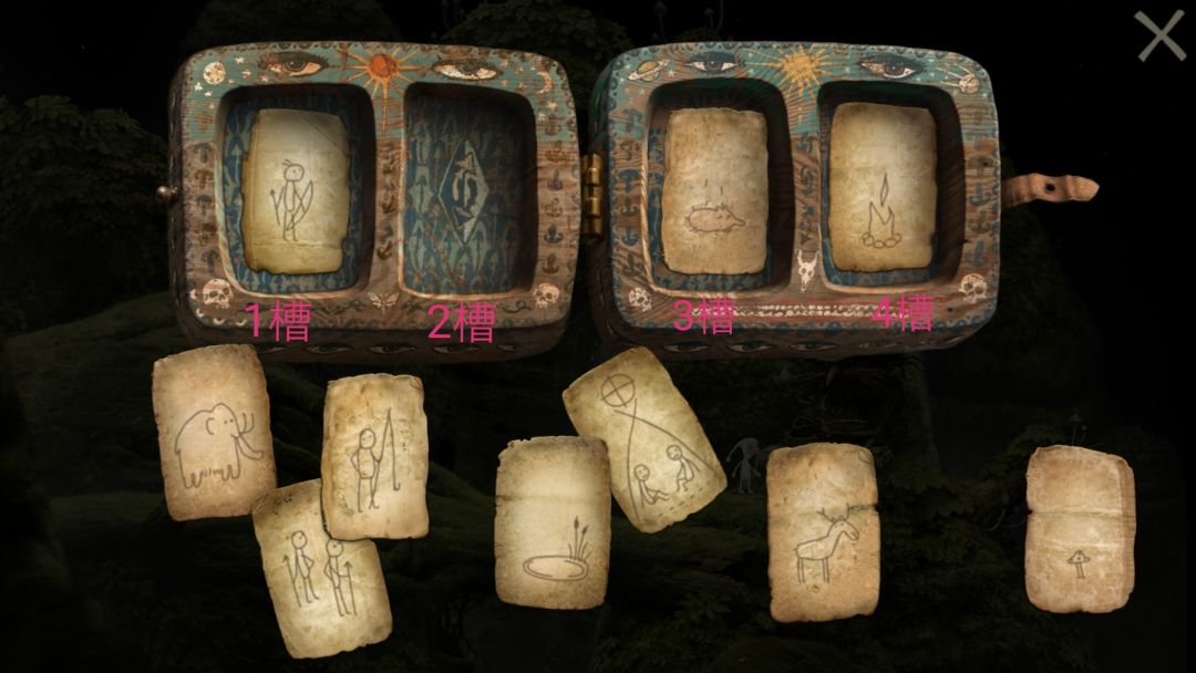 4.将弓兵放入1槽,将野猪放入2槽。得到食物猪。 5.将食物鹿、象、鱼和猪依次放入1槽,篝火放入2槽。再把全部烤熟的食物依次放入1槽,把有两人坐着的卡片放入2槽。完成任务,就借到采蘑菇爷爷的折叠刀。
