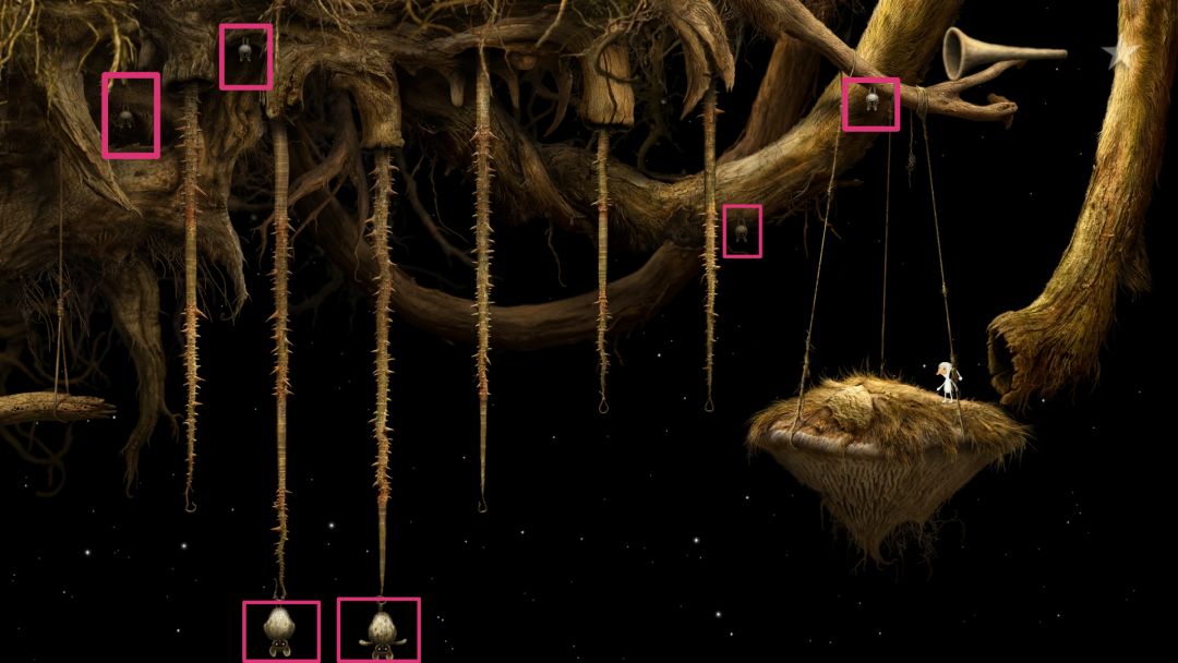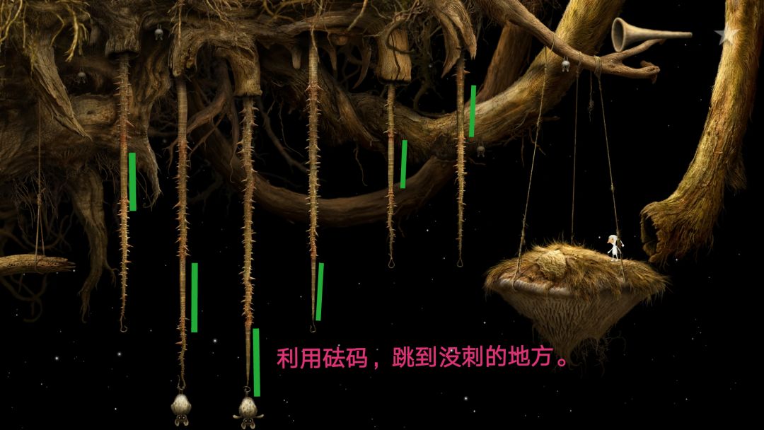 抓住机会按住飞行的大蝙蝠,把它们当成砝码挂到刺藤上。刺藤上有一段没有刺的,利用大蝙蝠的重量改变刺藤的长短,让小白可以跳到没有刺的那一段,慢慢跳到左侧的平台上,往左走。