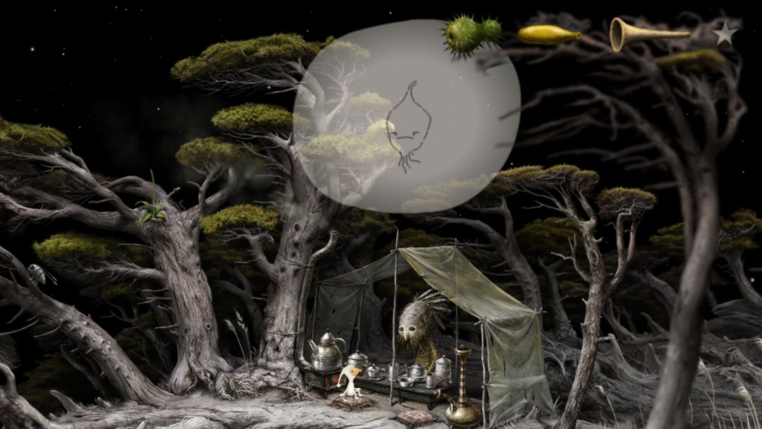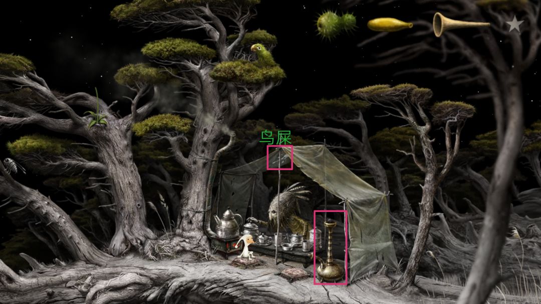点上方绿色的鸟,鸟会拉屎到帐篷上,趁泡茶老人上去擦鸟屎时摸一下右边的长壶,获得成绩。