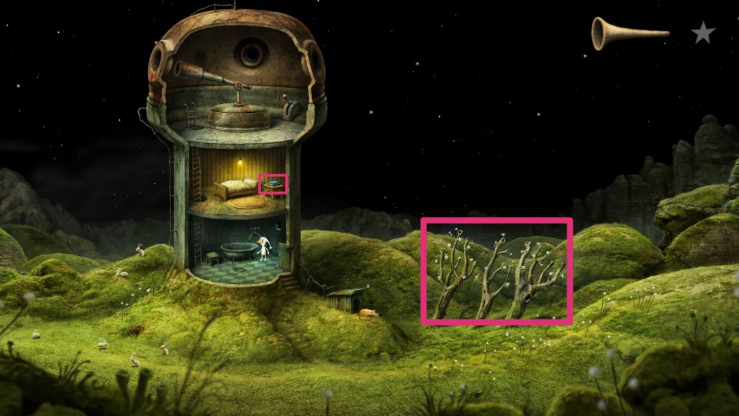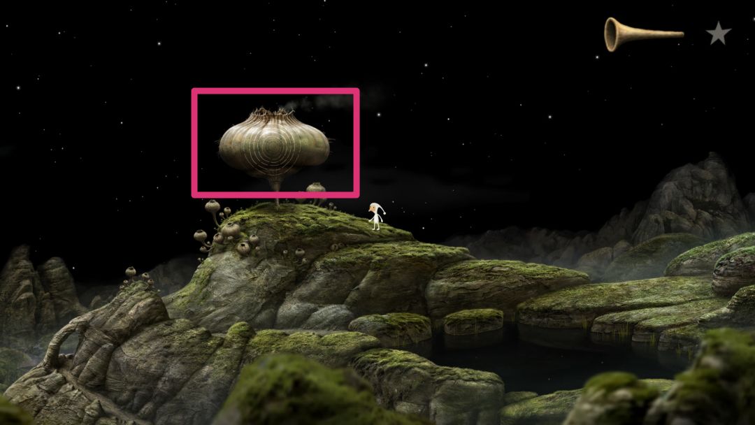 往左边进入下一个场景,靠近类似于蘑菇的植物,用喇叭听一听,得知我们用于探险的飞船长什么样。