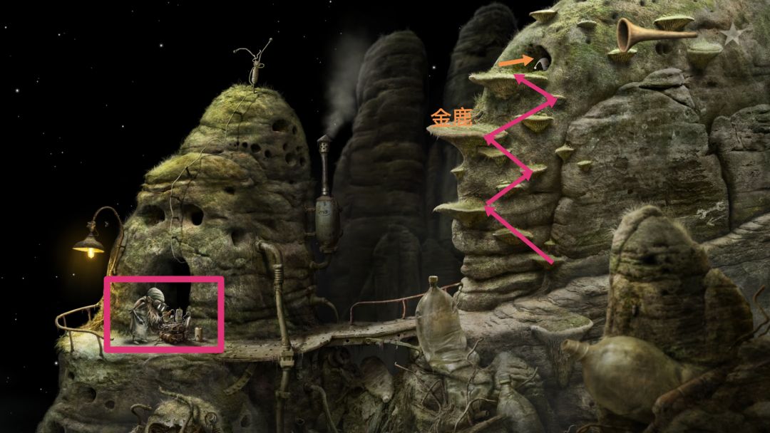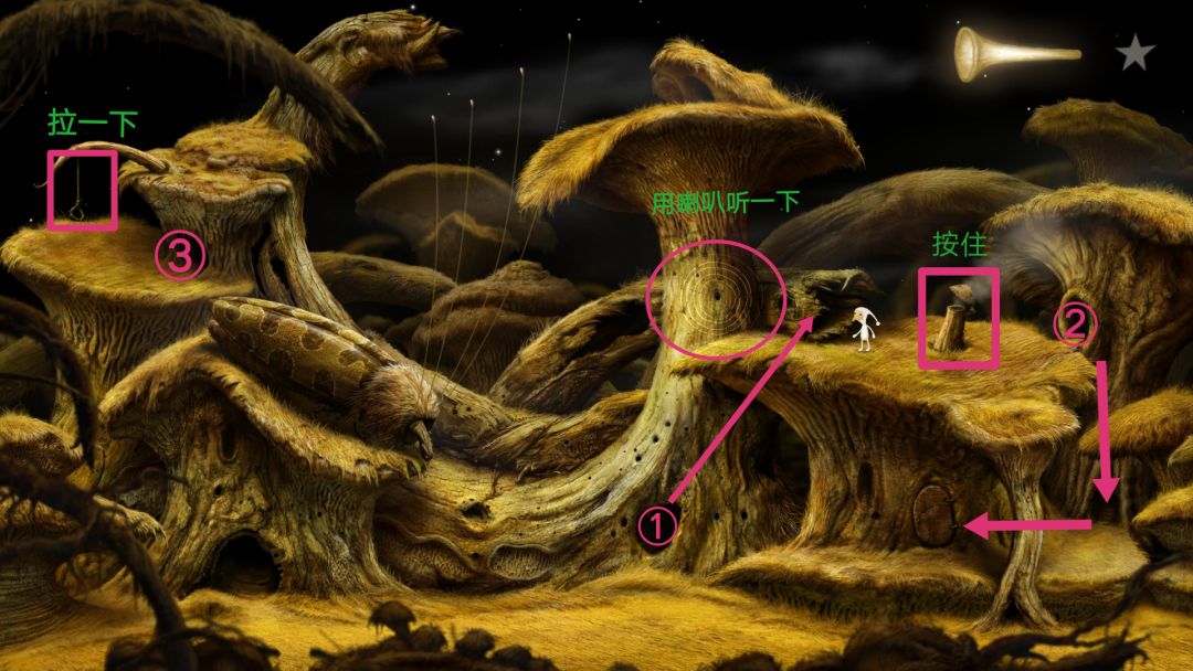 到了第二个主星球,往左走。到了后进入图上①的洞口进去,出来后用喇叭听下蘑菇茎,得知我们需要到达蘑菇顶上。然后按住右边的烟囱盖,一位女士就被呛出门呼吸空气,这时迅速从②洞口下去,进去她家。出来后就出现在左上角的地方,拉一下这个吊绳,然后进去③洞口,出来后进去①洞口,就可以到蘑菇顶部了。
