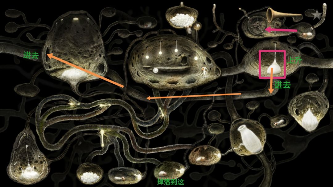 回到之前有枯木的地方,再往右走。回到蚂蚁唱歌的场景,右走再左走进入洞内。