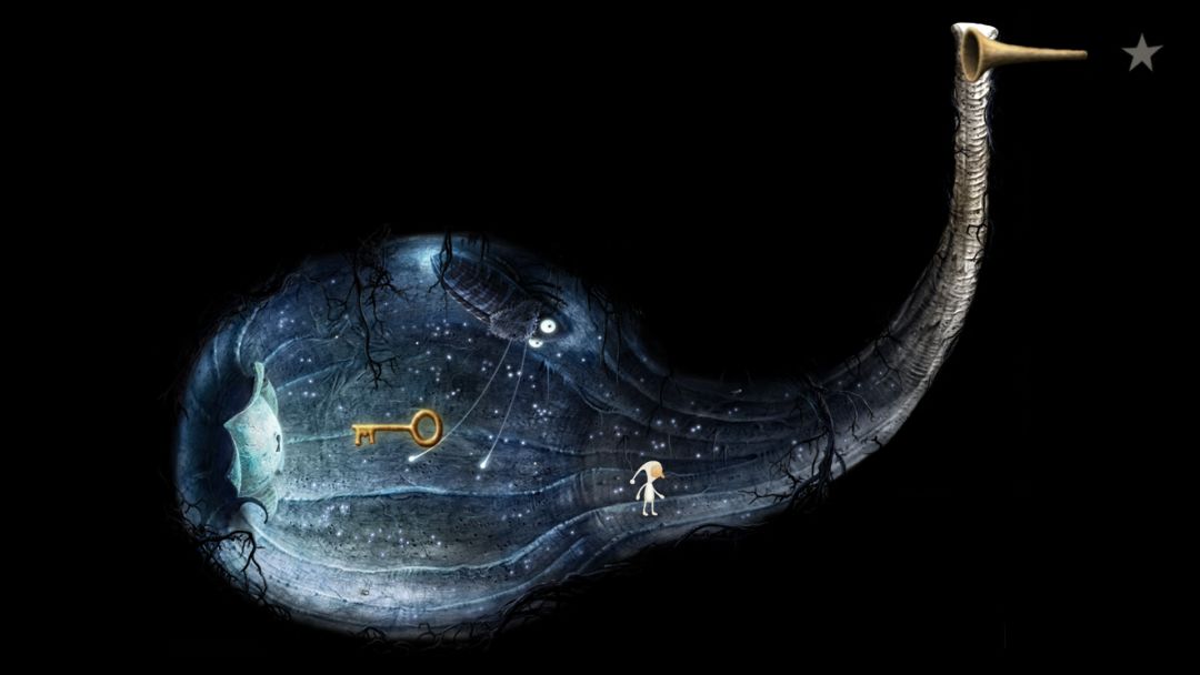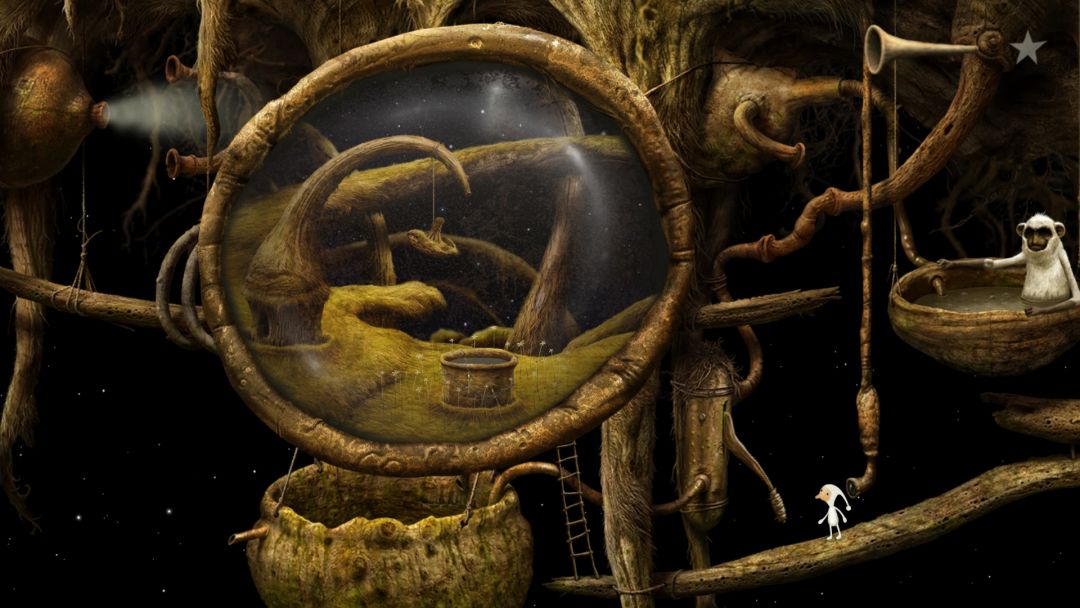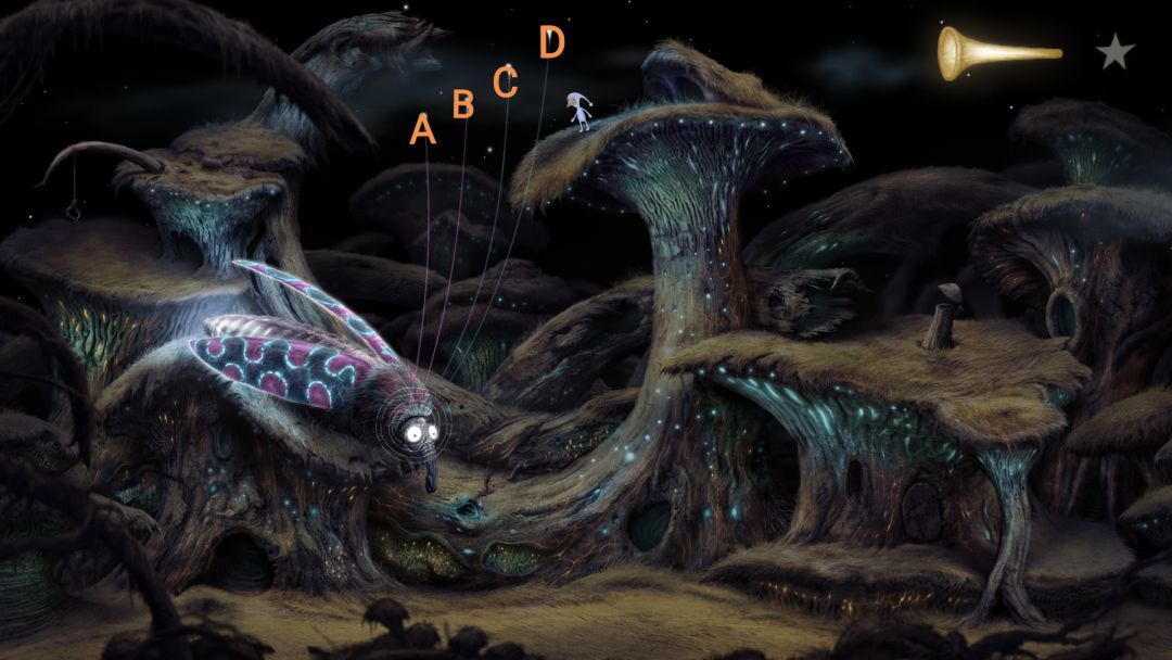 之后往左走,这个场景里有个缆车,坐上去后来到新场景。走近那个表盘怪,用喇叭听一下,得知我们需要把三个表盘上的指针调到指定位置。上下移动那三根草,可以调节表盘上的指针。成功调完后,去点那三只像娃娃鱼一样的小家伙,之后就会有一段特别长的音乐。