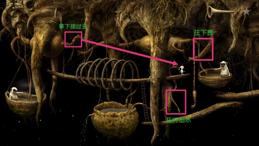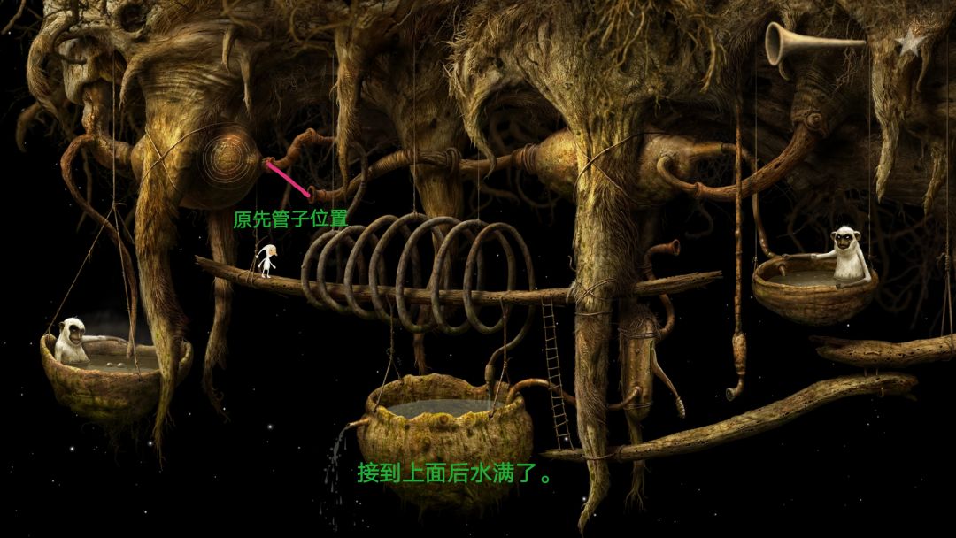 杯子里的水满后,左边的管子升起,出现了小洞。然后将导管接回原来的位置,不然猴子不让你走。