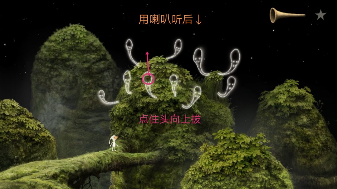 走近图中那堆树木,用喇叭听一下会出现一些白色“灵魂”,将他们的头部往上拉,他们会群魔乱舞后消失,然后生出许多蘑菇,老人就会出来采蘑菇。