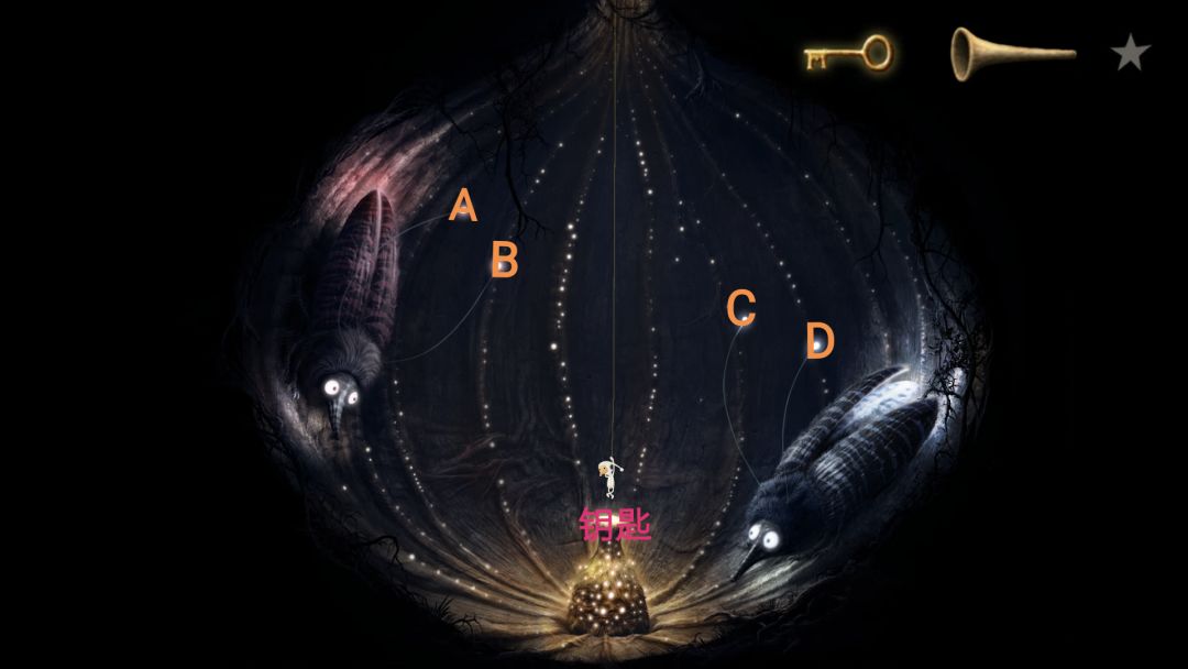 洞里有两只瓢虫,按ACCBDA的顺序点瓢虫的触须,随后场景变蓝。使用右上角的道具,出现粉蓝两只瓢虫,得知新触碰顺序。按CDABCCAADDDBBB的顺序点瓢虫的触须,下方会出现一个凸起,获得钥匙。
