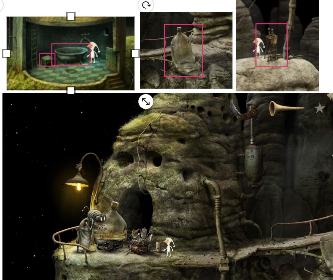 该场景往下走,爬到右侧上方的洞里隐藏起来,等金鹿过来,跳到它的上面,获得成就。然后下来去点矿泉水瓶,得知我们需要拿锐器割开矿泉水瓶,再与正在维修机械的爷爷谈话,得知造飞船需要那些材料。