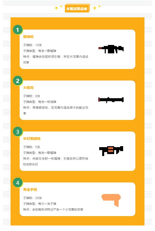 虽然不像毒蛇火箭筒一样能发射巨型蛇蛇,但火箭筒同样是威力非常强的武器,它可以发射六枚炮弹,在撞击后引爆大量伤害,它的爆破能力可以轻松破坏地图,就连小黄也难以hold住它的坏脾气!